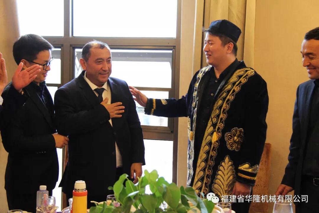 在两方参观完生产车间后,华隆机械行地主之谊,热诚得邀请乌方纳沃伊州代表团到冠豪大酒店用餐。乌方纳沃伊州市长也表示出了满满的诚意,拿出乌兹别克斯坦传统圆饼形面包与我们分享。并为华隆机械销售部经理披上象征乌兹别克斯坦最高荣誉的传统服饰。